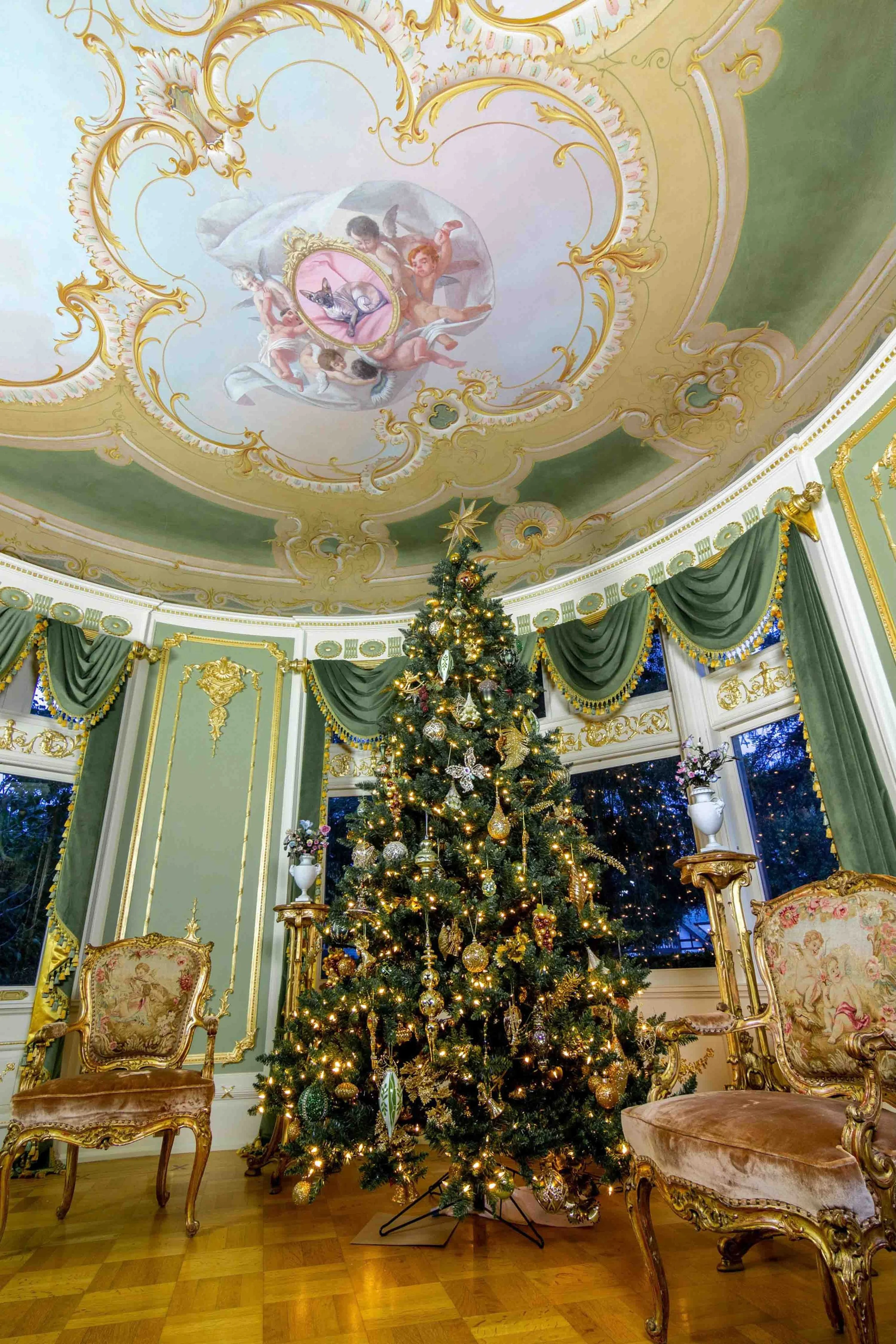 We restored a ballroom ceilng mural, that had been severely damaged over 150 years. The client requested we replace the original with her beloved cat—making the space truly her own. Ceiling mural restoration and cat portrait by Hattas Studios.