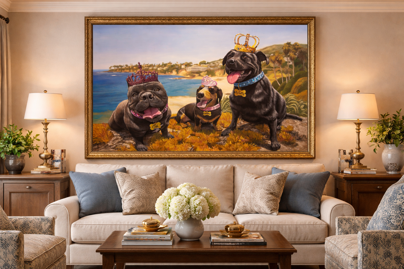 This homeowner wanted a statement-piece painting of her three beloved dogs. These lucky royals grace her walls with smiling faces and their names on their tags. Painting by Hattas Studios.