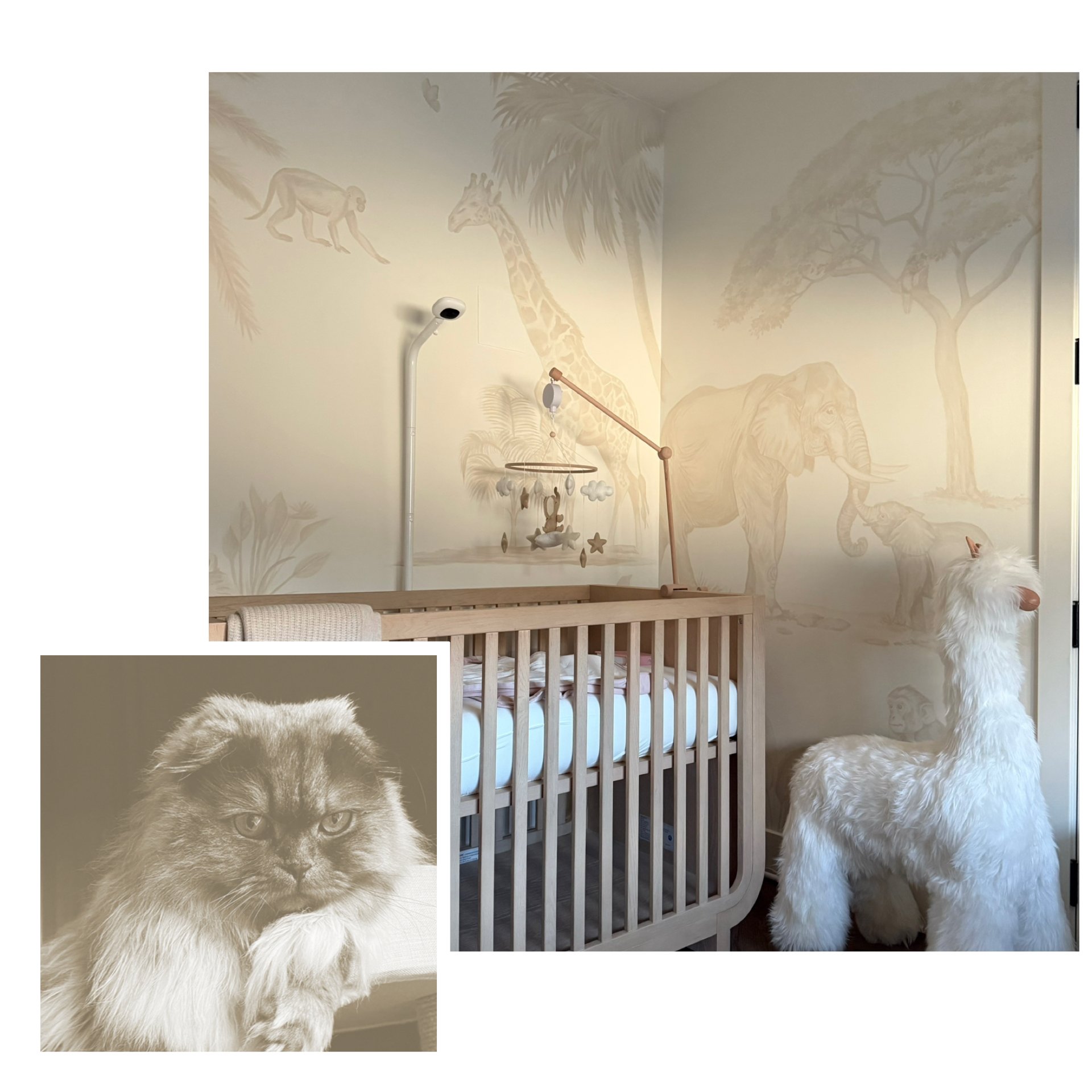 This new mother imagined a soft, monochrome nursery with her favorite safari animals, including her own beloved cat painted in the tree. Mural by Hattas Studios.
