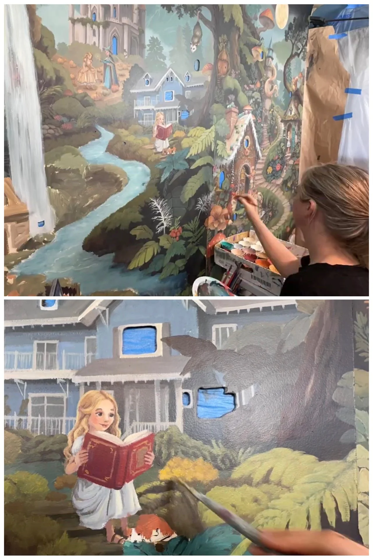 Painting “The Enchanted Nook” mural at Pasadena Showcase. Eight classic fairytales are in the mural, including an original fairlytale of Clara Baldwin as a young girl, sitting in front of her house with her fairy tale book and dog. Room design and mural by Hattas Studios.