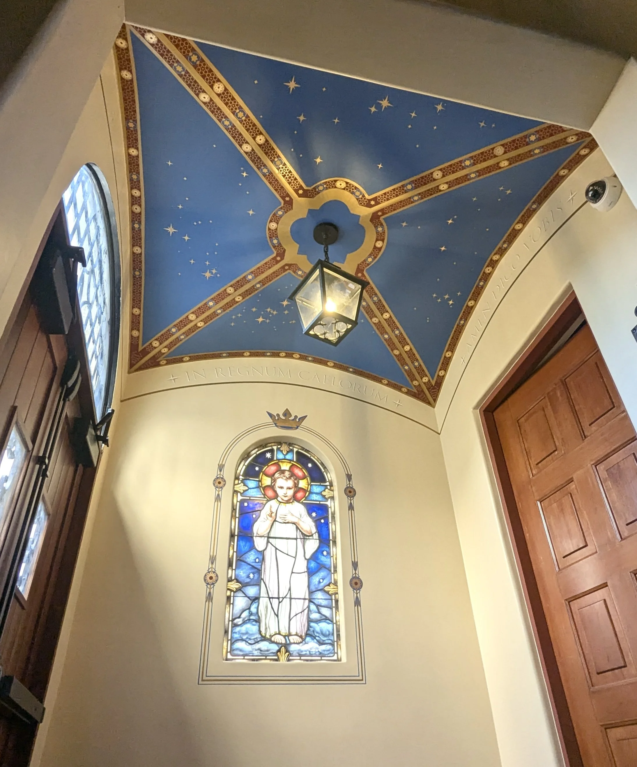This ceiling at Holy Innocents Church was a dedication to their 100 year anniversary. The gilded stars on the ceiling represent the star chart from the night the church was founded 100 years ago. Mural by Hattas Studios.