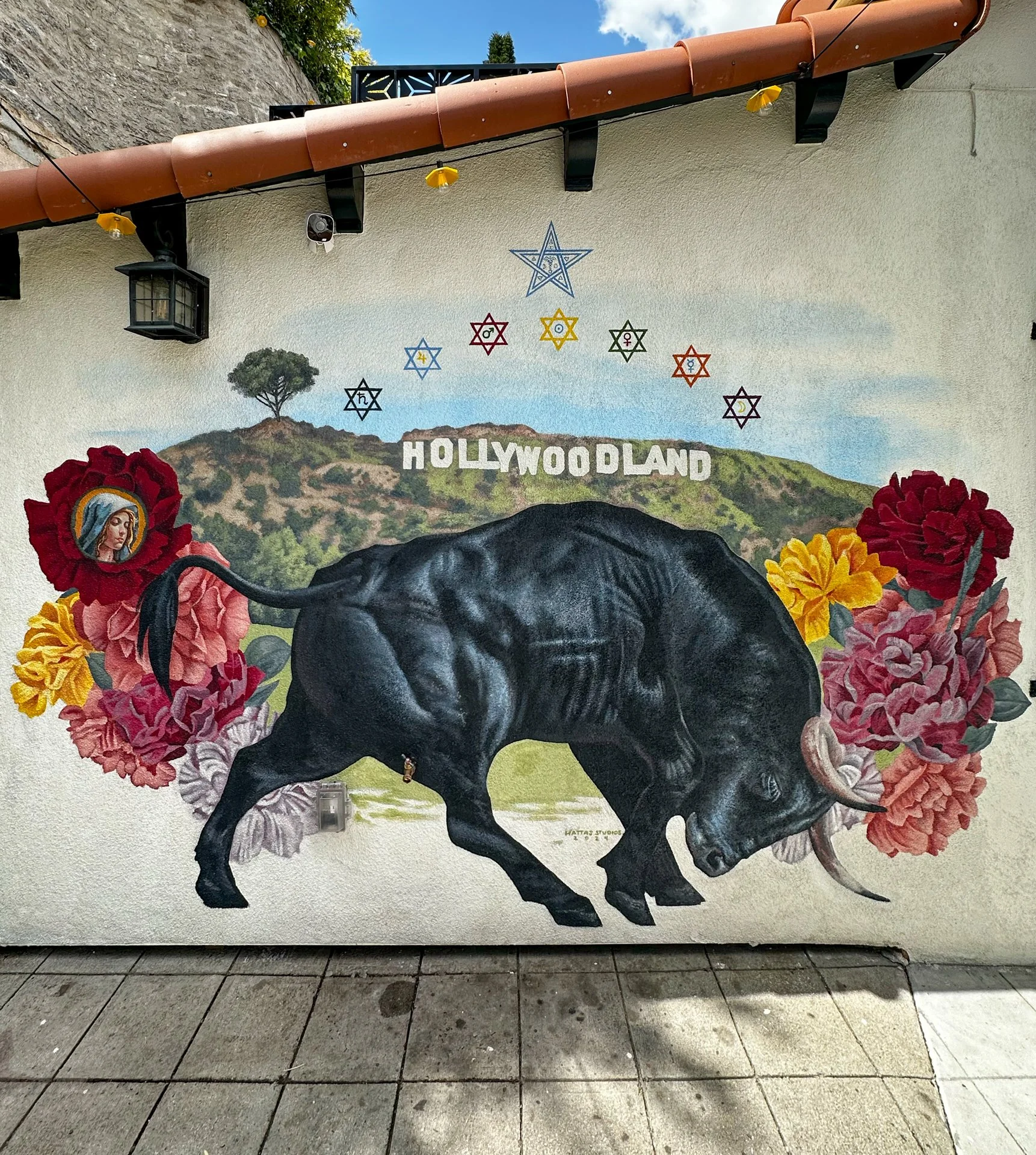 This homeowner in the Hollywood Hills wanted to incorporate several meaningful symbols in her original work of art, that welcomes guests as they arrive to her home. Mural by Hattas Studios.