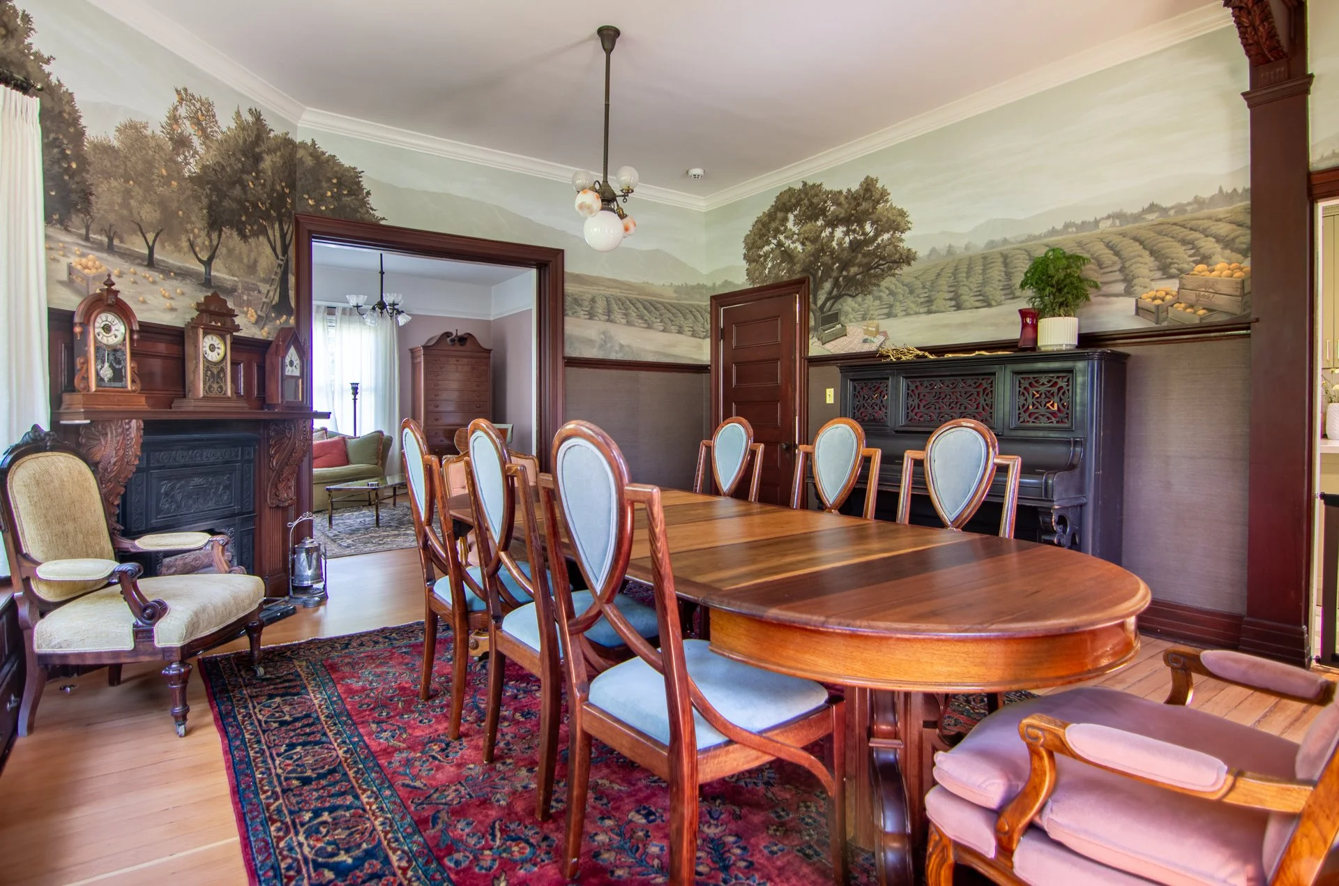 This historic home was sold with all of it’s original furniture and heirlooms. The new homeowners paid homage to the home’s history, painting an orchard mural to represent the original orchards on the land; and by including over 30 hidden easter eggs in the scene, representing artifacts found in the home. Mural by Hattas Studios.