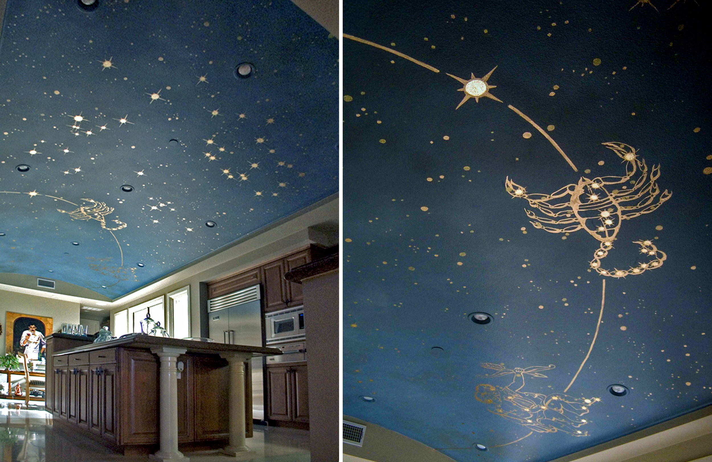 The mural includes all 12 horoscope constellations, with two specifically called out: Scorpio and Gemini. These are the personal signs of the homeowners themselves.