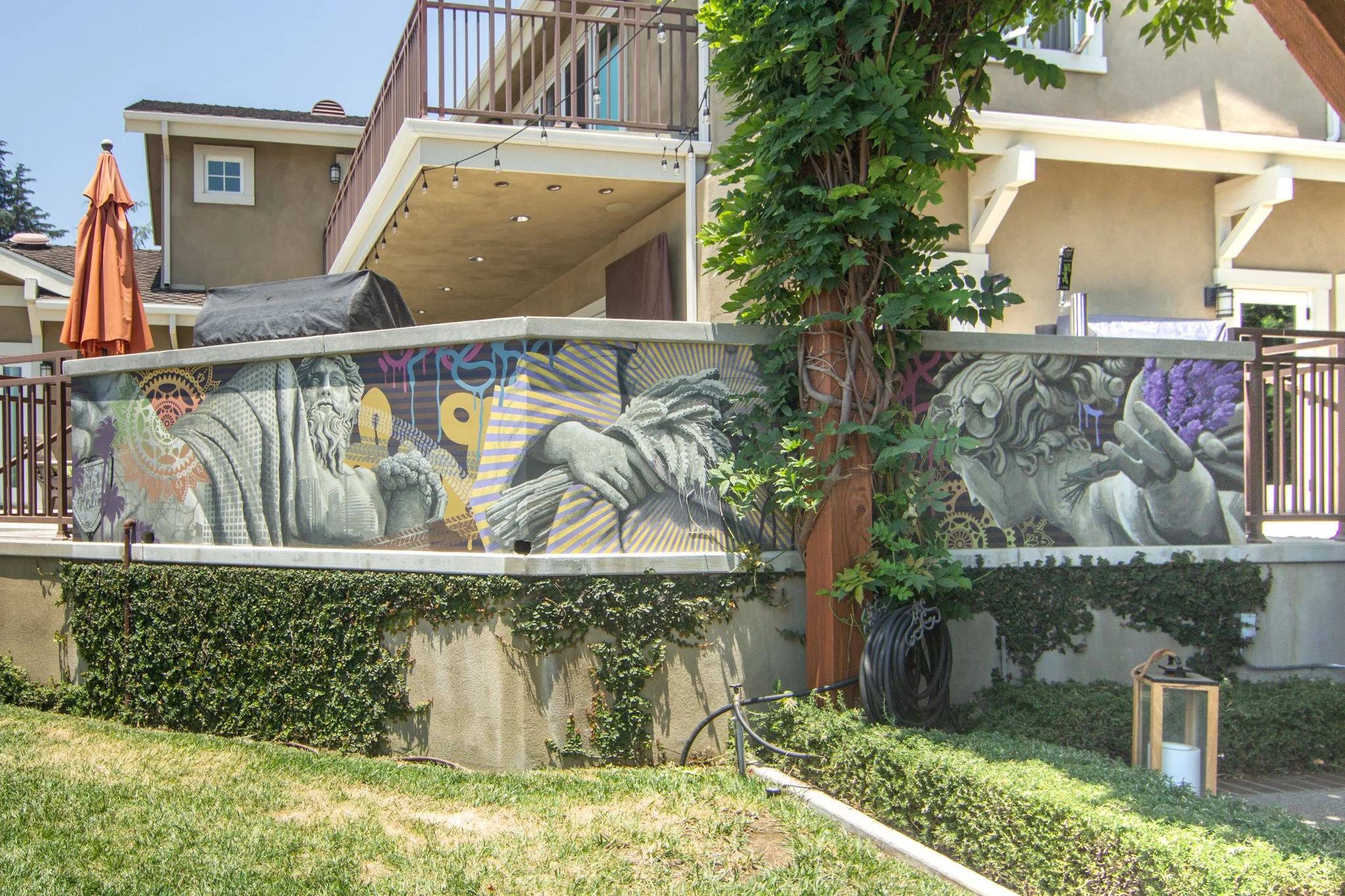 This outdoor mural is filled with symbols meaningful to the homeowners, including the family name, their work, hobbies, and favorite stories. Designed by Realize Fine Art Photography. Painted by Hattas Studios.