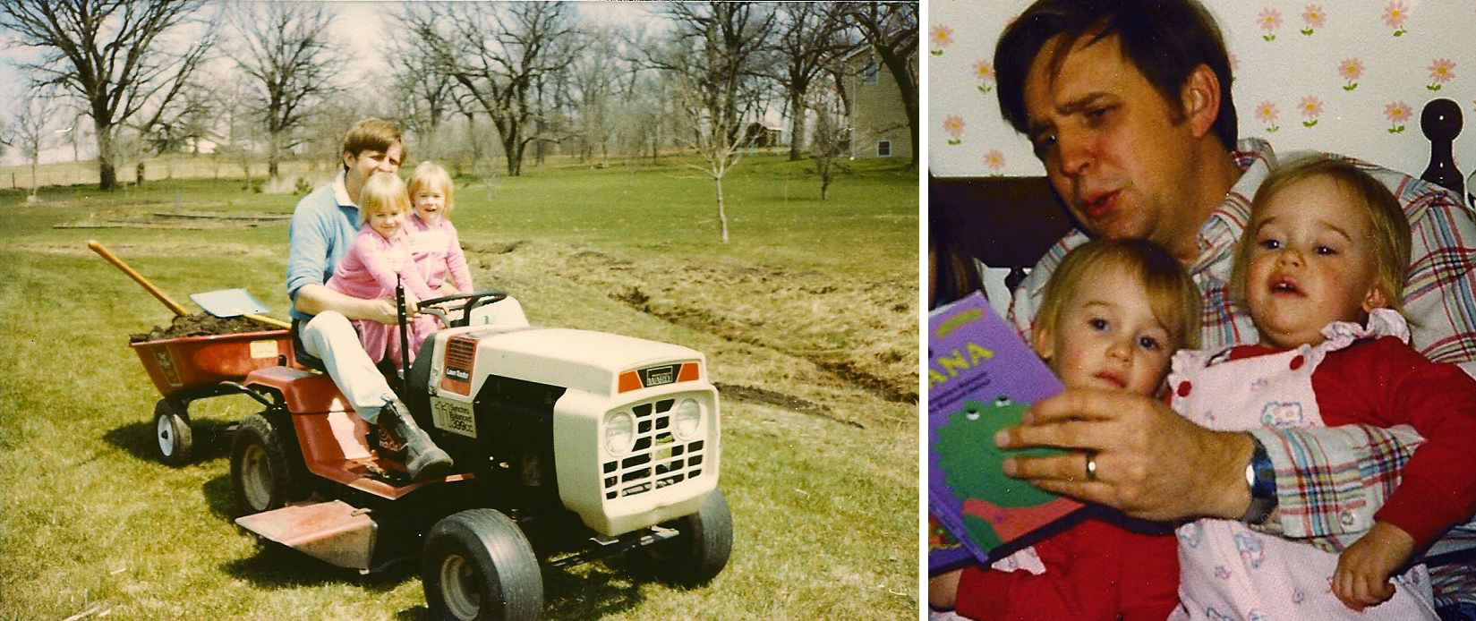 Jeanine Hattas Wilson (CEO & Creative Director) and Julie (Hattas) Kennedy (Senior Art Director) growing up as identical twins in the country, and reading stories with their dad.
