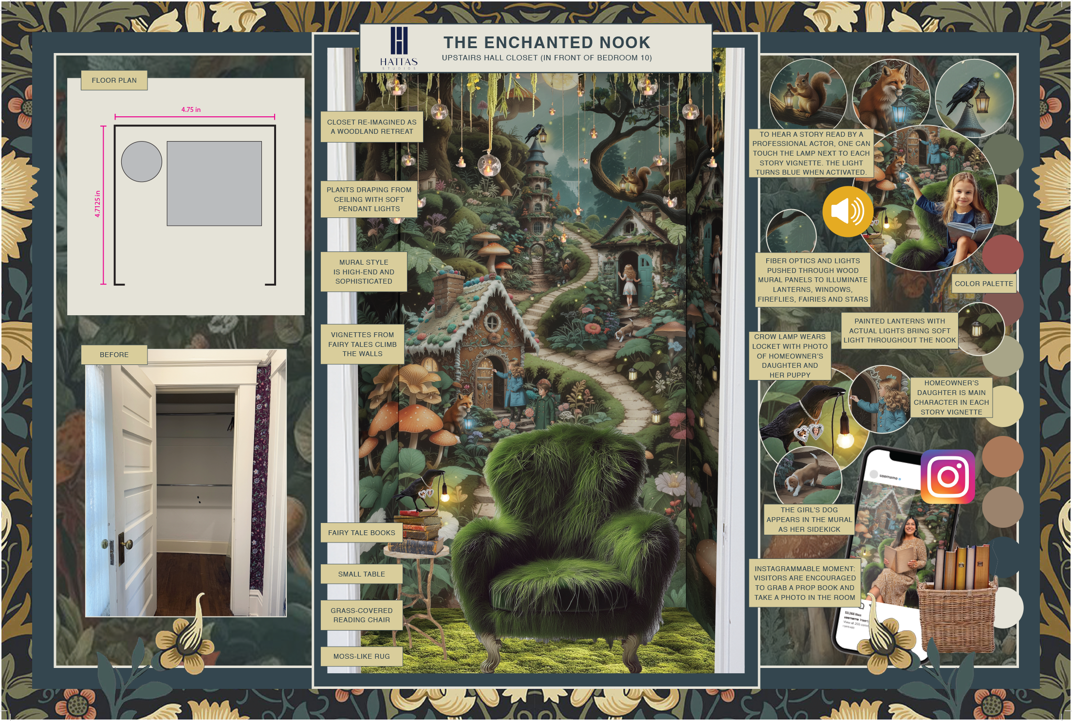 Hattas Studios’ mood board for “The Enchanted Nook" — a mural-filled enchanted forest in a small closet at Pasadena Showcase House of Design 2026.