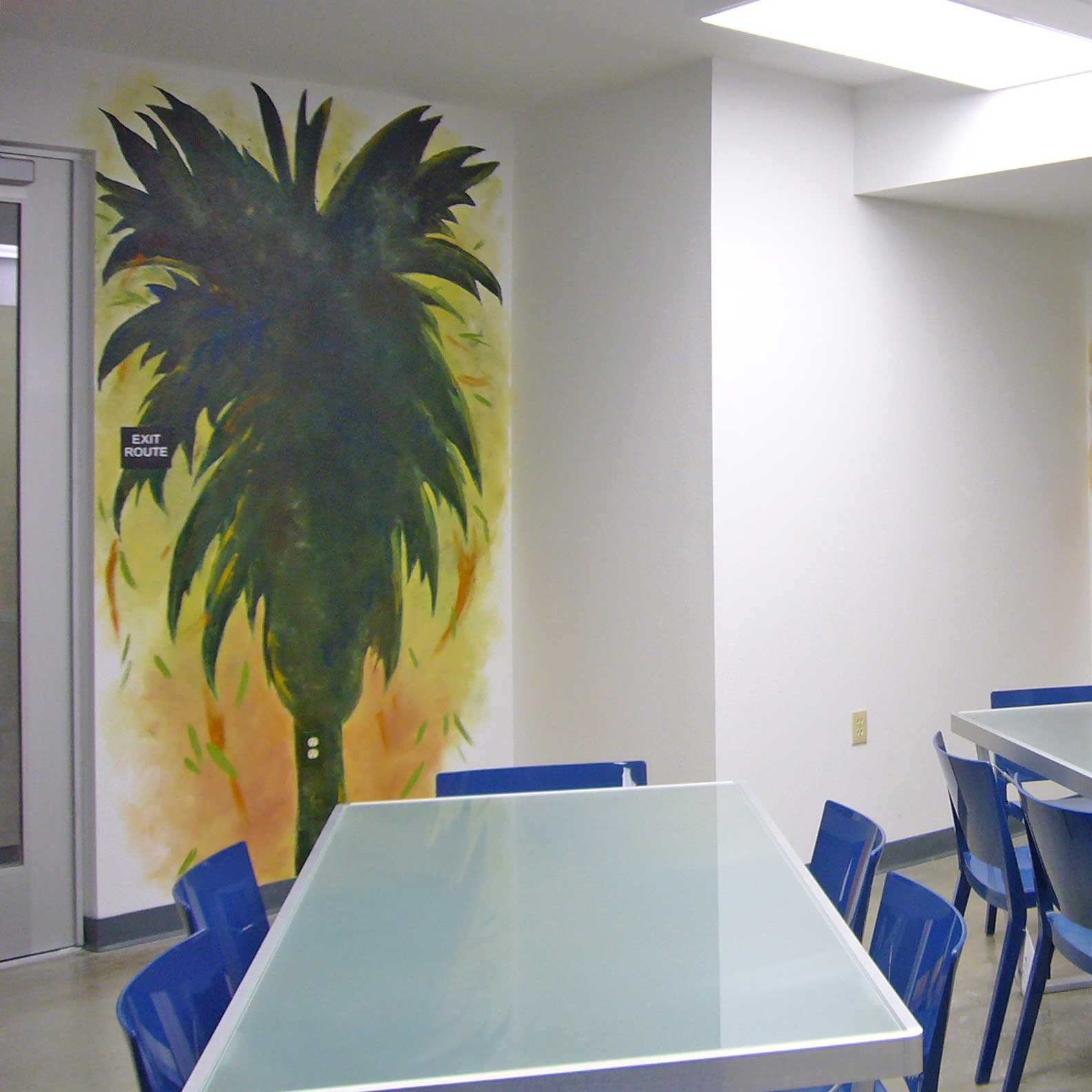 Hattas Studios worked with Marlaina Fey Rose to paint three abstract palm trees in a new apartment complex for houseless individuals on skid row.